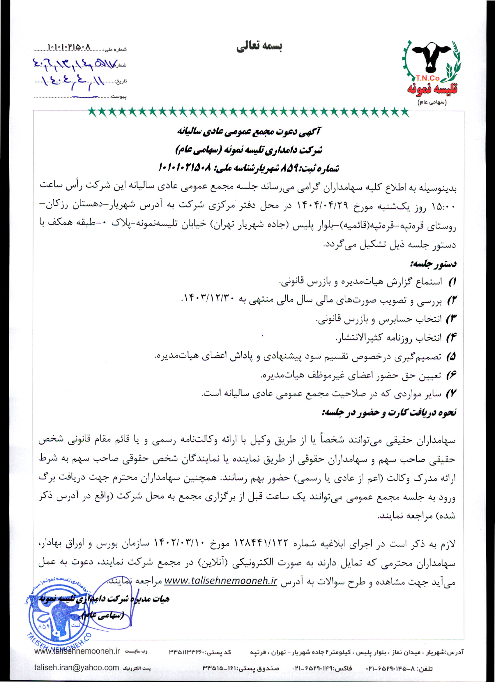 دعوت به جلسه مجمع عمومی عادی سالیانه شرکت دامداری تلیسه نمونه
